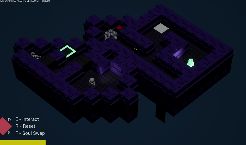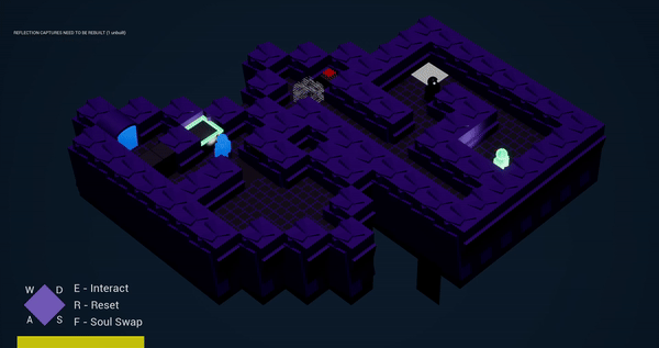 A huge priority in sprint 2 was to add more player facing information to ensure that the player understands what is going on in the game. For example, I added audio to interactable objects, visual feedback when objects are interacted with, different materials for the main player and the soul swap player, colors/materials matching the entity/object that corresponds to their use, etc.. I’m particularly proud of the Soul Swap visual feedback, as I wasn’t all that sure how to go about coding it, but it ended up looking and feeling pretty good.