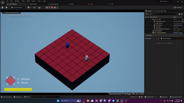 Up to this point, I had never worked with a tile-based game. I was used to working with third or first person games with collision, which Tournamental did not have. There was a huge learning curve, as I had no external documentation for how the systems work, and could only look through the blueprints within the project to understand how things work within a tile-based coordinate system with no collision. It was a setback for a good majority of the project, as I would encounter myself implementing something new and realizing I had to implement it in a different way that would work with the tile-based project. Eventually though, I was able to get familiar with it and implement some things that I’m proud of.