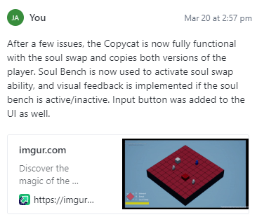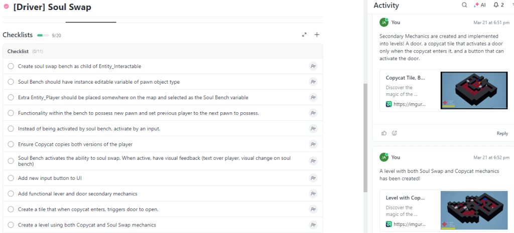 Now that I had created my own mechanic, I was tasked with finding a mechanic created by a classmate and implementing it into my game. I needed to ensure that the two mechanics would be able to work well together to create a fun experience for the player. The mechanic that I chose was called “Soul Swap”, which allowed the player to repossess another player in the level by interacting with a “Soul Bench”. Once I decided on this mechanic, I created a new ClickUp task to track my progress, since it was pretty useful last week.